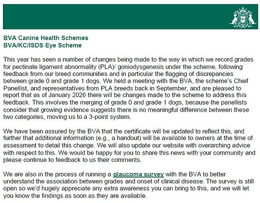 PLEASE NOTE: From January 2026, Gonioscopy results will be graded 1, 2 or 3 only. Any current '0' grades will be amended to '1' Please see below the Kennel Club notification regarding the forthcoming changes: